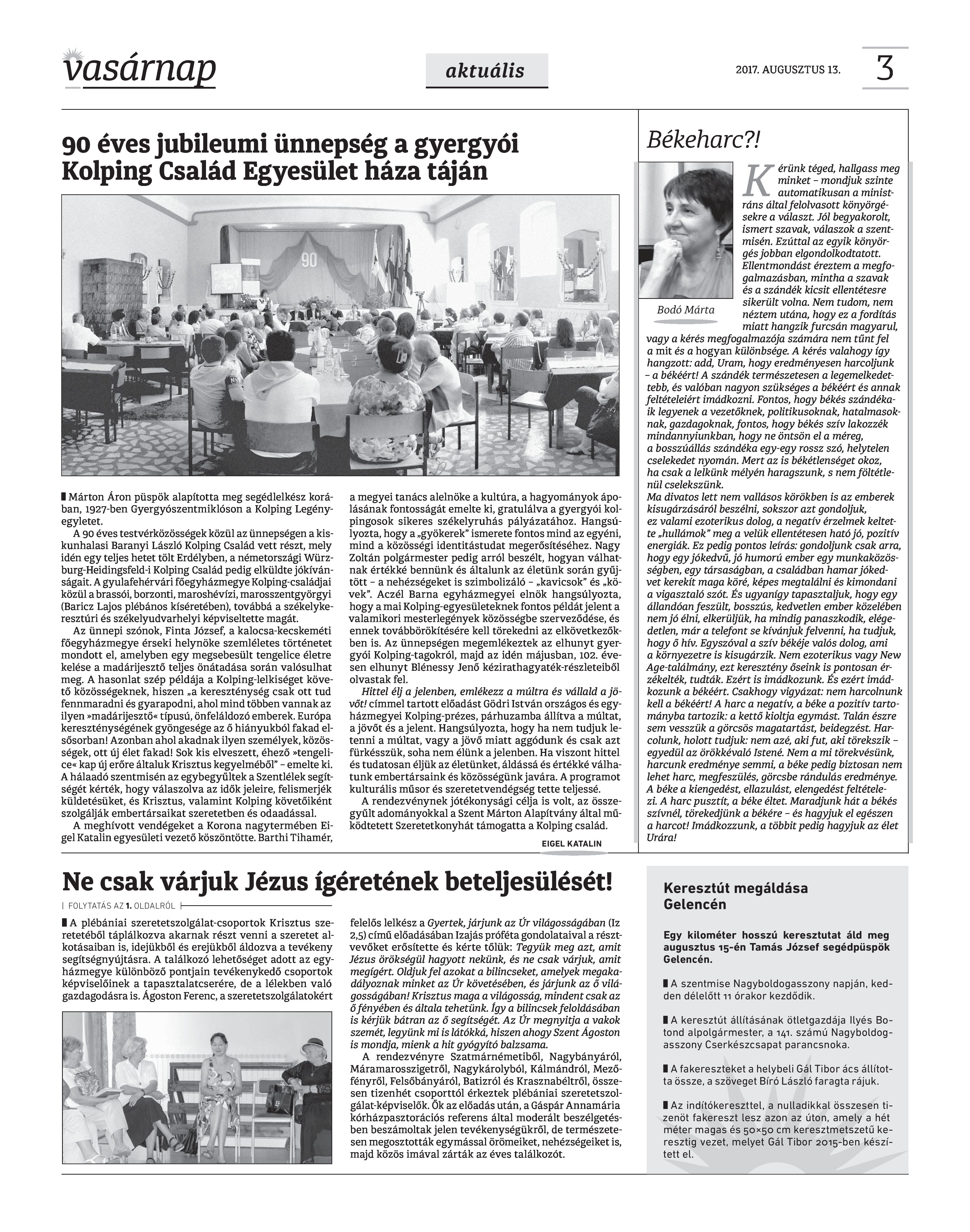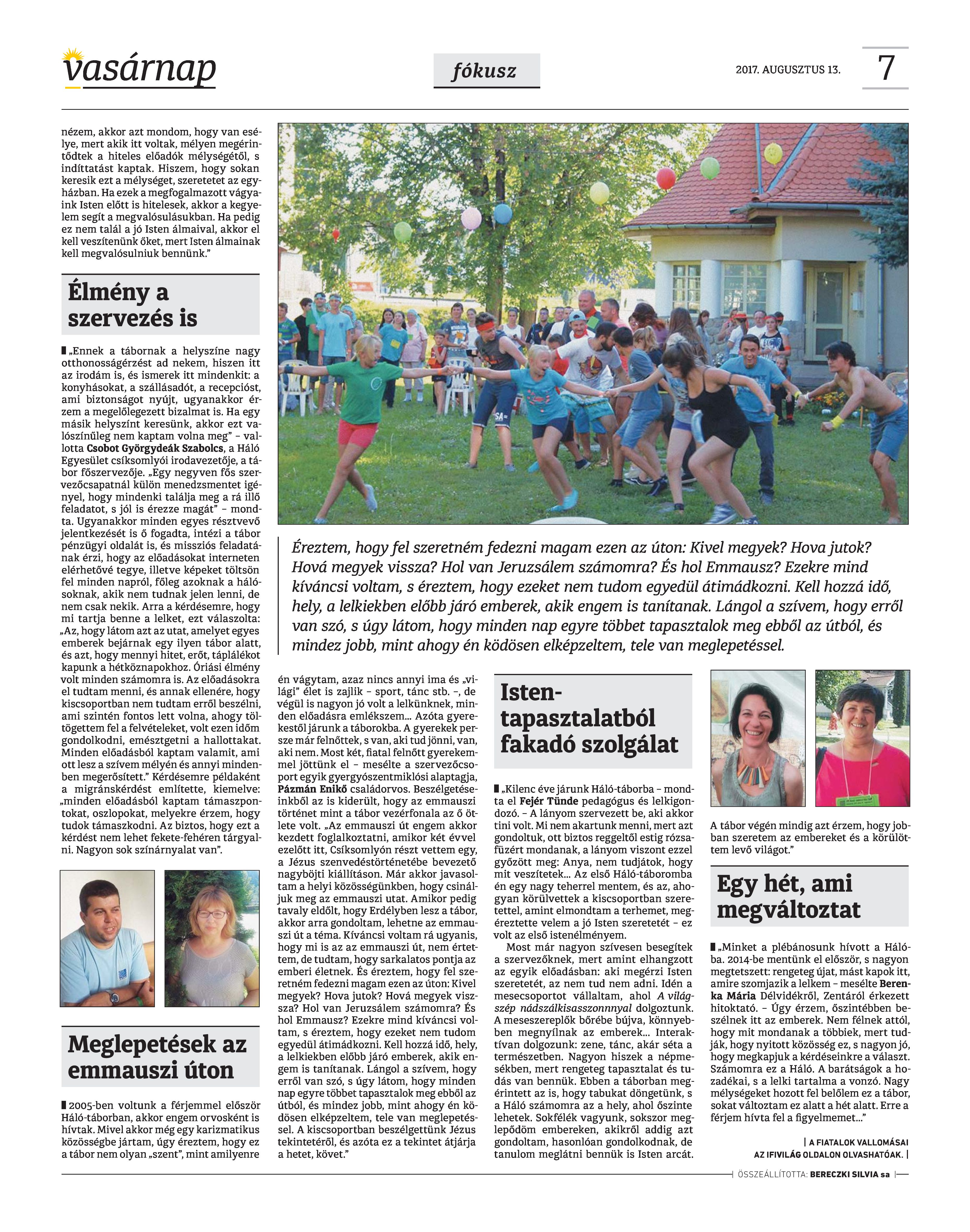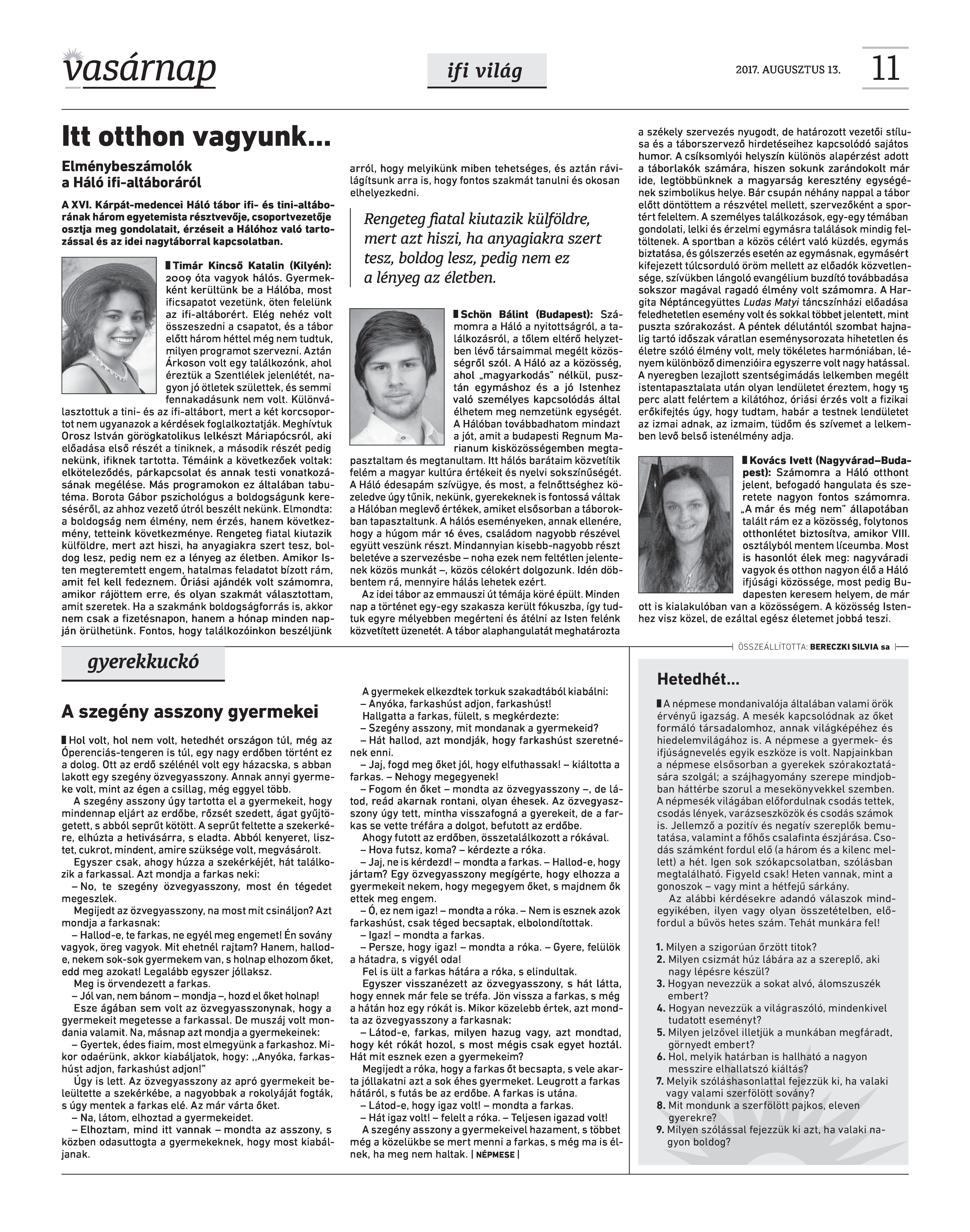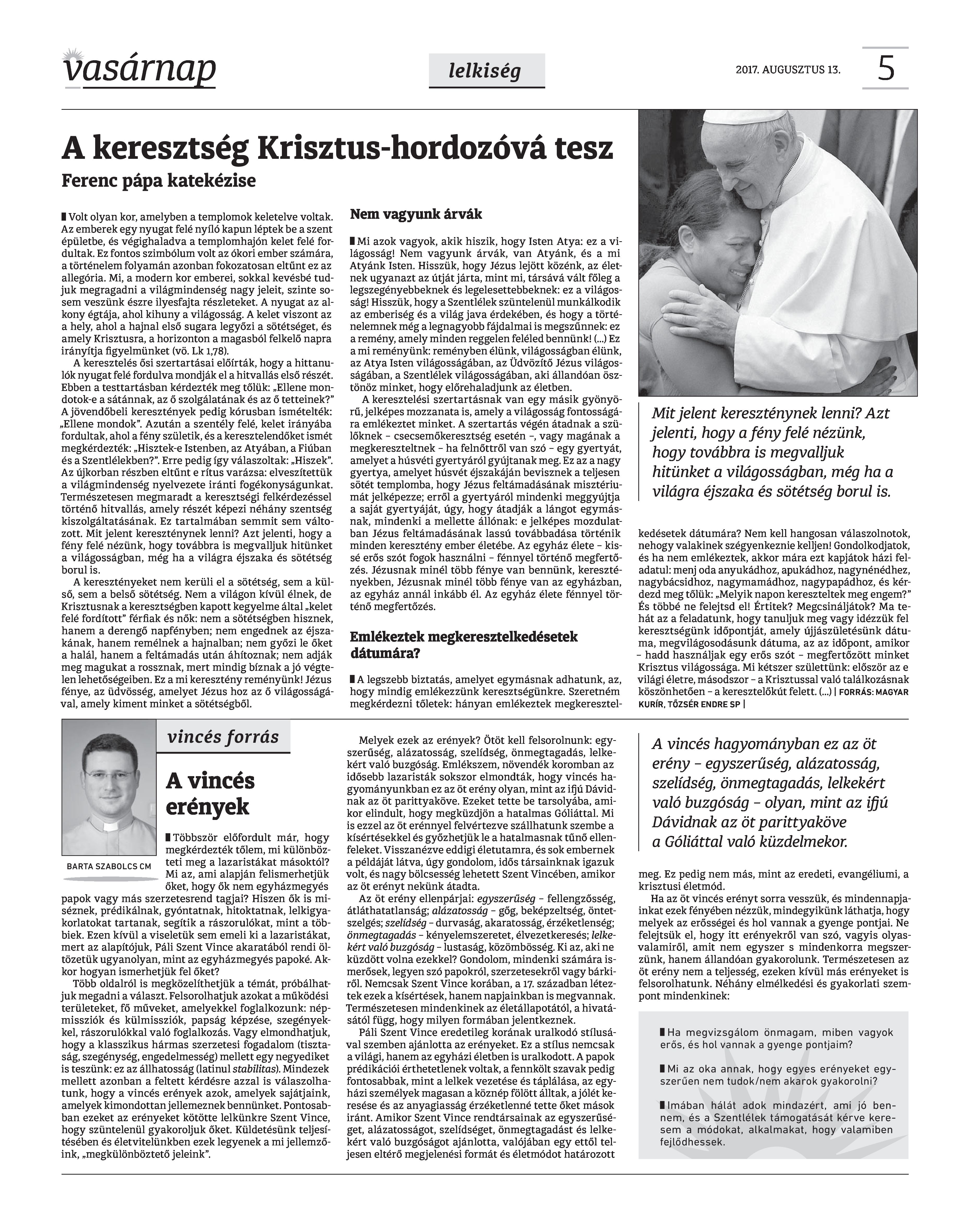 VASÁRNAP - 2017. AUGUSZTUS 13. A Vasárnap Katolikus Hetilap 2017. augusztus 13. / XXVII. évf. / 33. számának digitális változata. 1 / 12 2 & 3 / 12 4 & 5 / 12 6 & 7 / 12 8 & 9 / 12 10 & 11 / 12 12 / 12