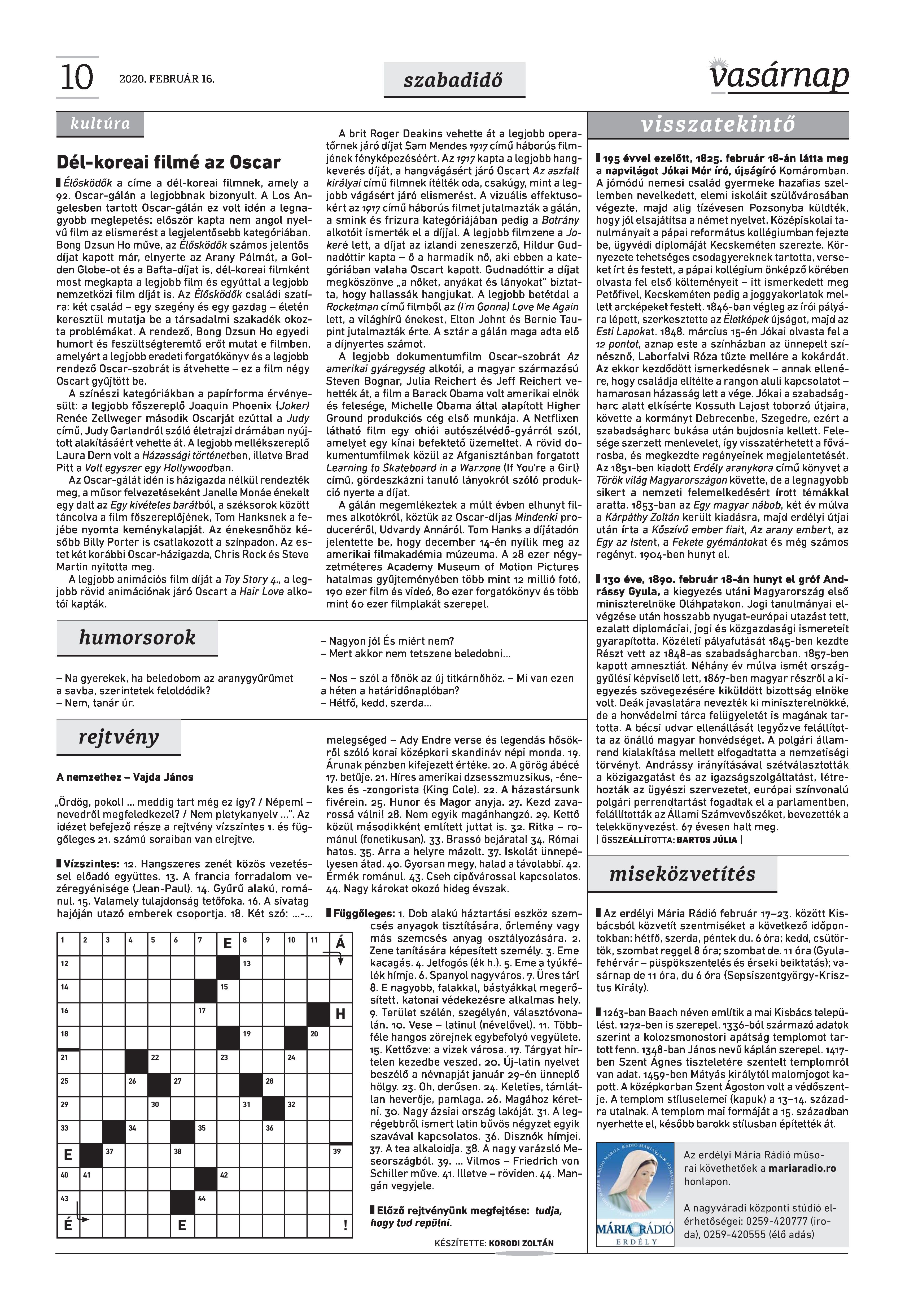 VASÁRNAP - 2020. FEBRUÁR 16.