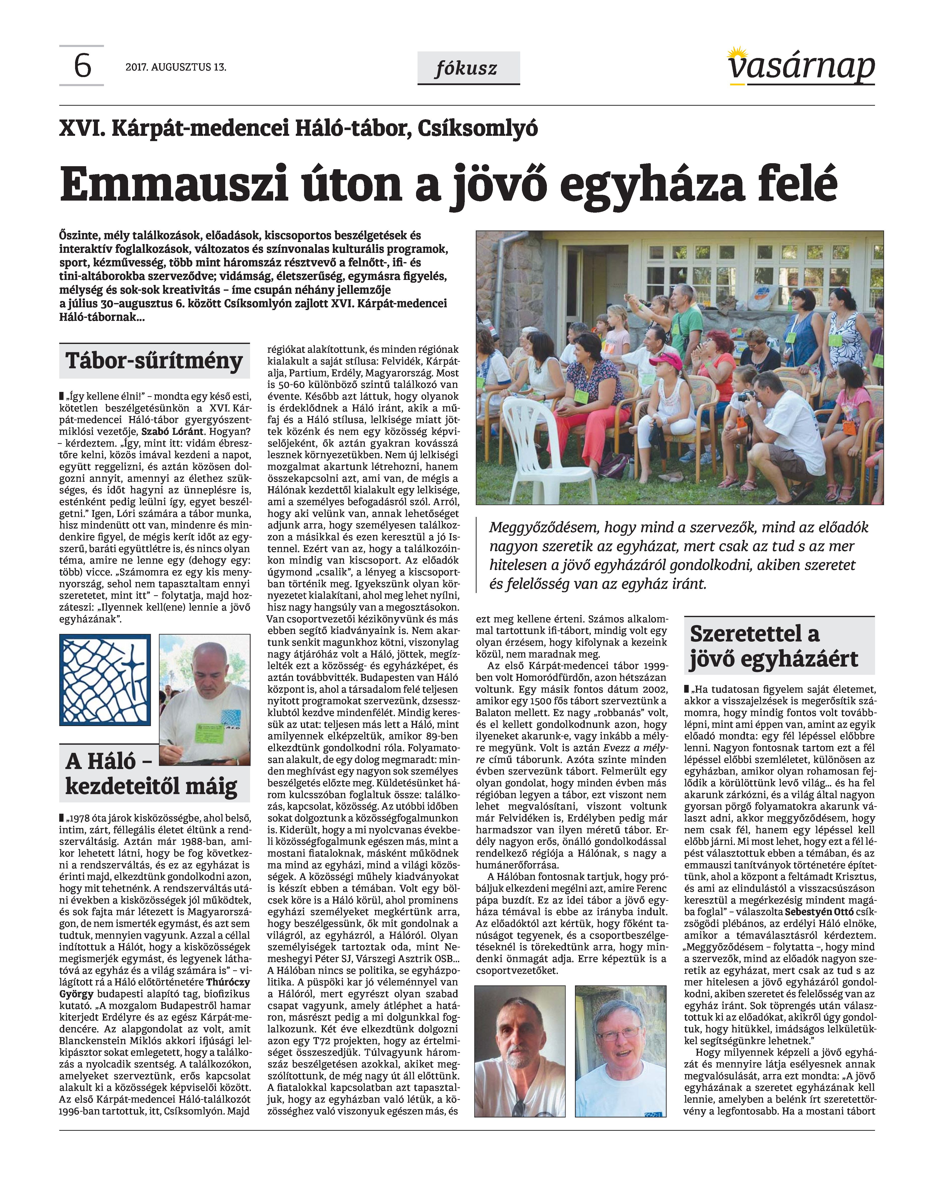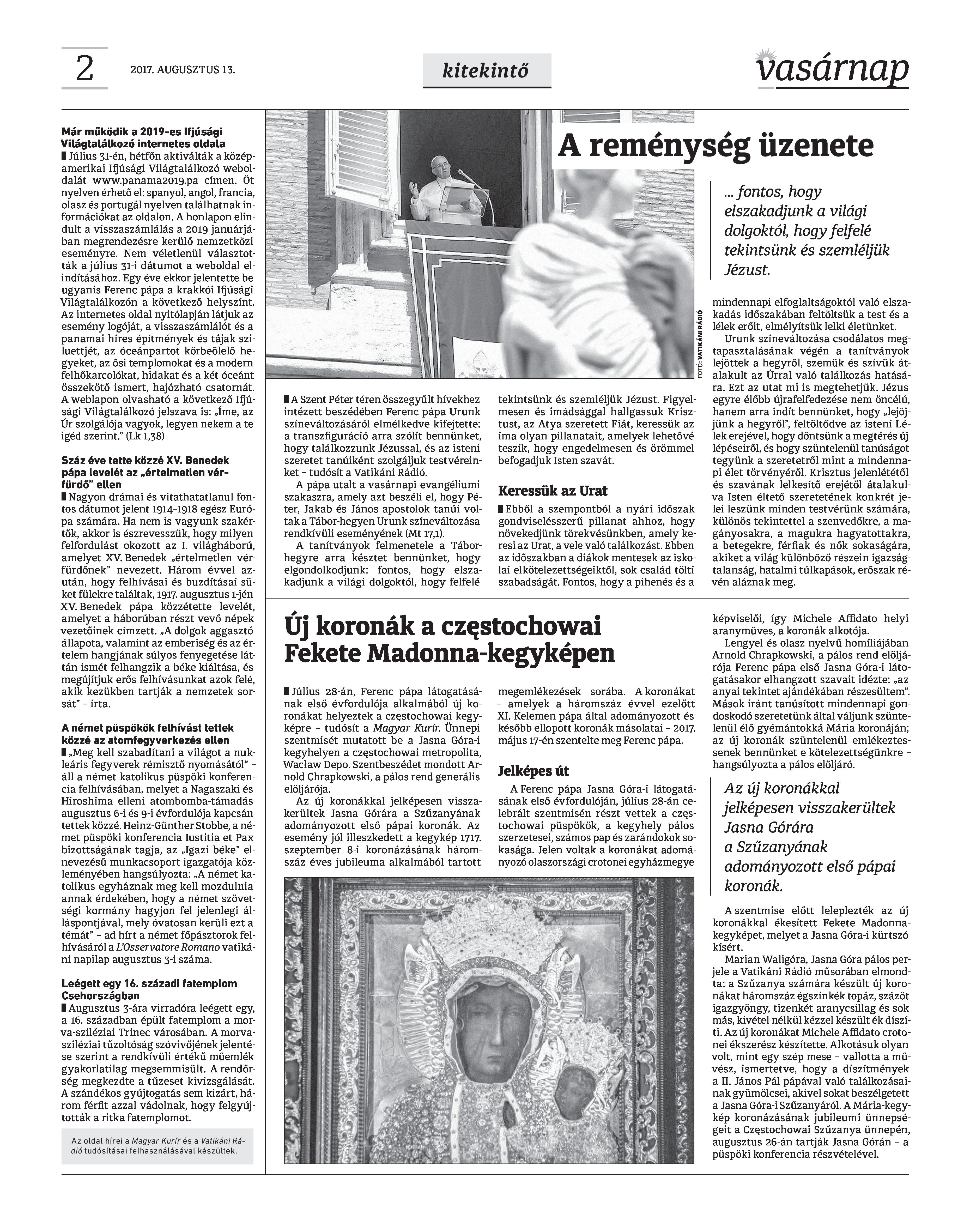 VASÁRNAP - 2017. AUGUSZTUS 13. A Vasárnap Katolikus Hetilap 2017. augusztus 13. / XXVII. évf. / 33. számának digitális változata. 1 / 12 2 & 3 / 12 4 & 5 / 12 6 & 7 / 12 8 & 9 / 12 10 & 11 / 12 12 / 12